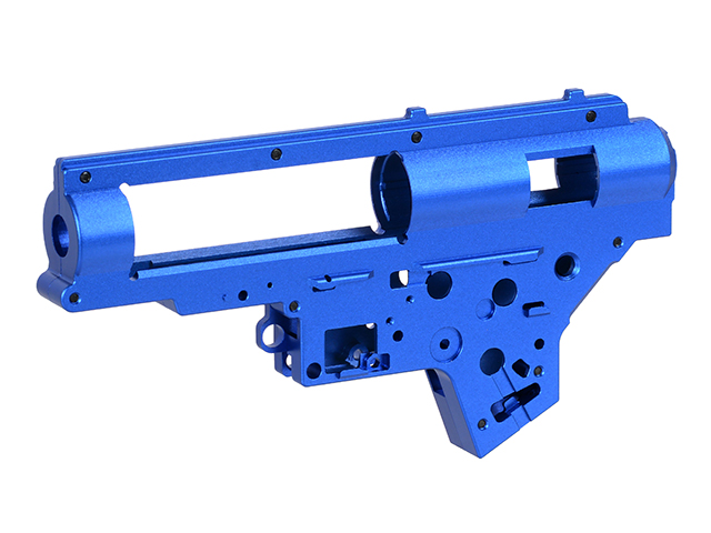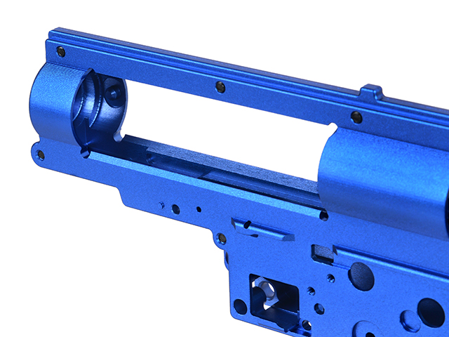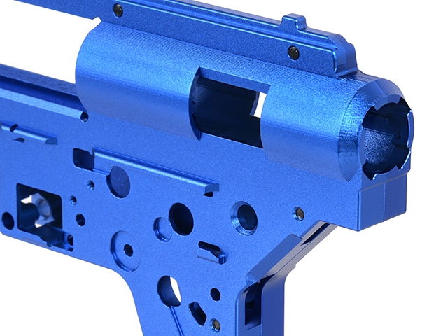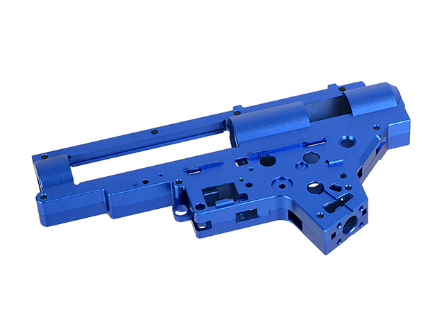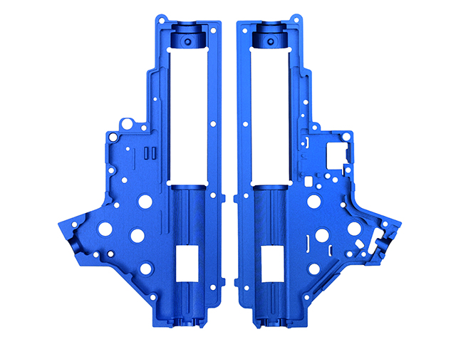 Carcasa de caja de cambios mecanizada con precisión CNC, diseñada para su montaje en la serie CM.098 (SR25/AR10). Superó pruebas extremas con un resorte M170. Fabricada con una barra de aleación de aluminio 6061 mediante máquinas CNC, con acabado anodizado azul. La carcasa admite rodamientos de 8 mm y guías de resorte con sistema de cambio rápido de resorte.