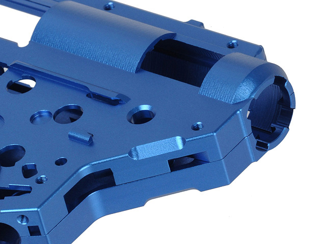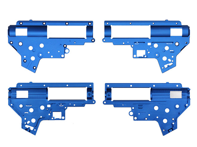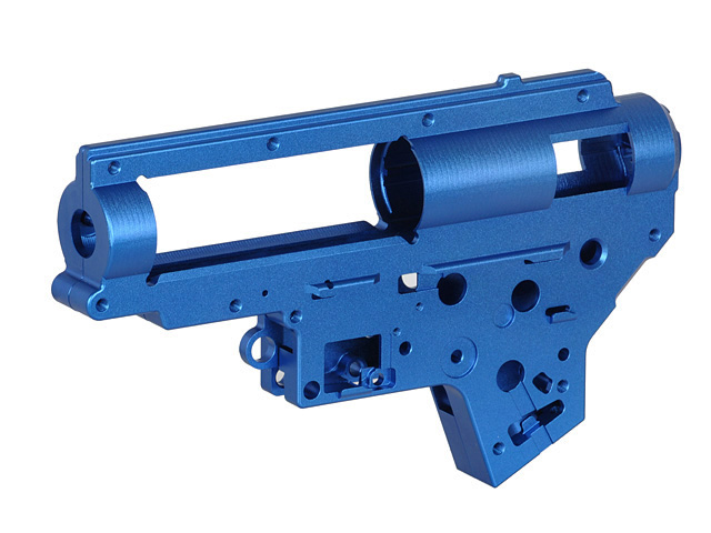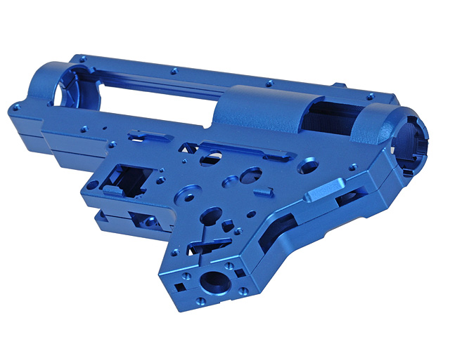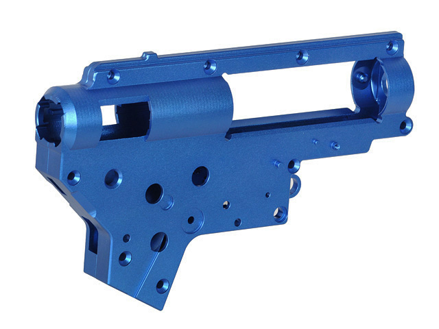 Carcasa de caja de cambios V2 mecanizada con precisión CNC, diseñada para su montaje en la serie CM.097 (AR15/M4). Superó pruebas extremas con un resorte M170. Fabricada con una barra de aleación de aluminio 6061 mediante máquinas CNC, con acabado anodizado azul. La carcasa admite rodamientos de 8 mm y guías de resorte con sistema de cambio rápido de resorte.