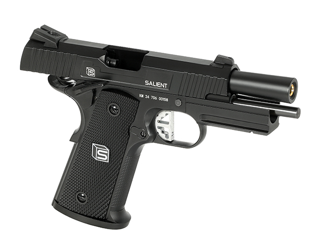 The **EMG Salient Arms 1911 Compact pistol** is the result of a collaboration between EMG and Salient Arms International, building on the success of the DS 2011 model. It features a traditional single-stack 1911 frame, combining classic elegance with modern functionality. The replica was designed with precision performance and user comfort in mind, blending aesthetics with ergonomics. It utilizes the proven 1911 design, renowned for its reliability for over a century.