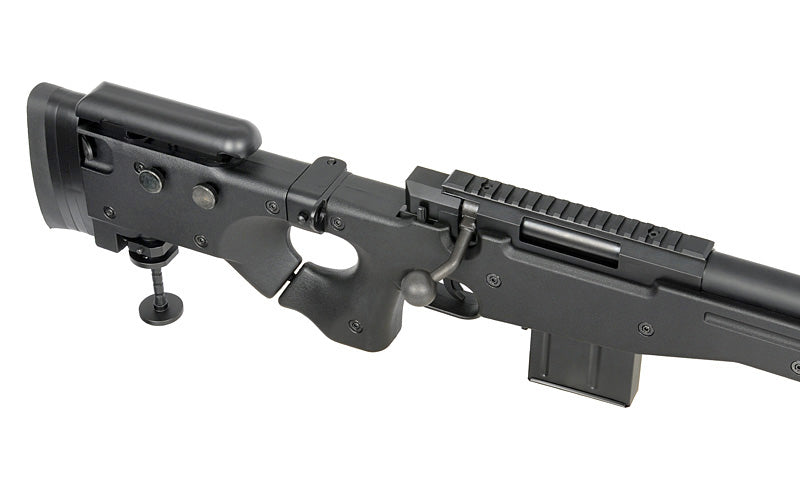 La réplica del CM.706 presenta una sólida construcción metálica montada sobre una culata reforzada de polímero negro, lo que garantiza una excelente estabilidad. La culata se pliega fácilmente hacia un lado , lo que facilita su transporte y almacenamiento. Además, la culata está equipada con una culata y un elevador de carrillera ajustables , que se pueden personalizar según las preferencias del tirador, lo que aumenta la comodidad y la precisión de disparo. El acabado engomado de la culata garantiza estabilidad en la posición de disparo. El rifle también incluye un riel de montaje para ópticas, correas tácticas y una montura para bípode, lo que ofrece mayor funcionalidad y versatilidad en el campo. Además, el rifle está equipado con un monópode ajustable , que aumenta la estabilidad del arma, especialmente durante disparos prolongados en el campo.
