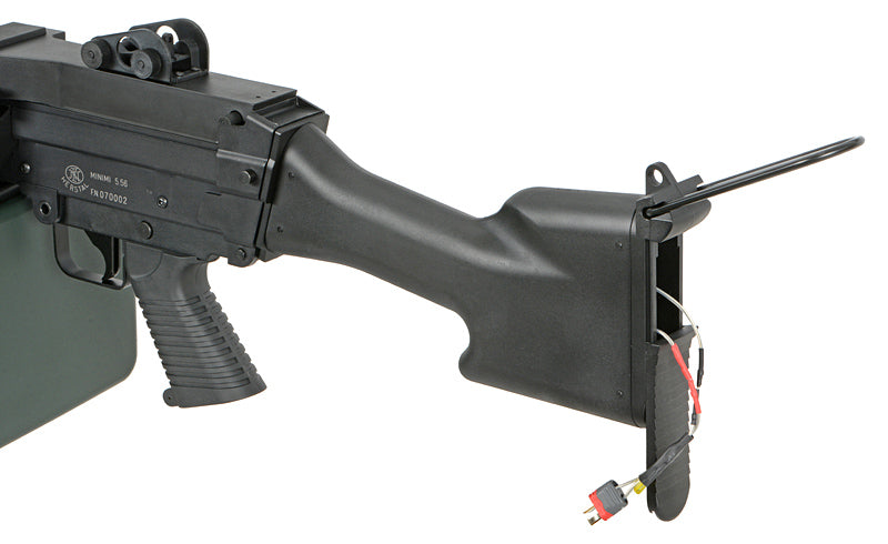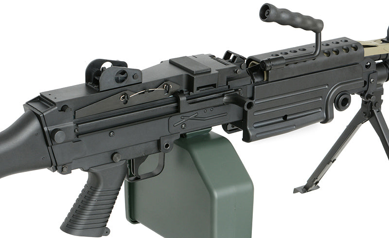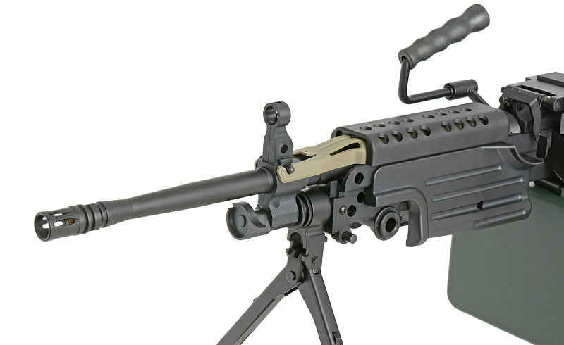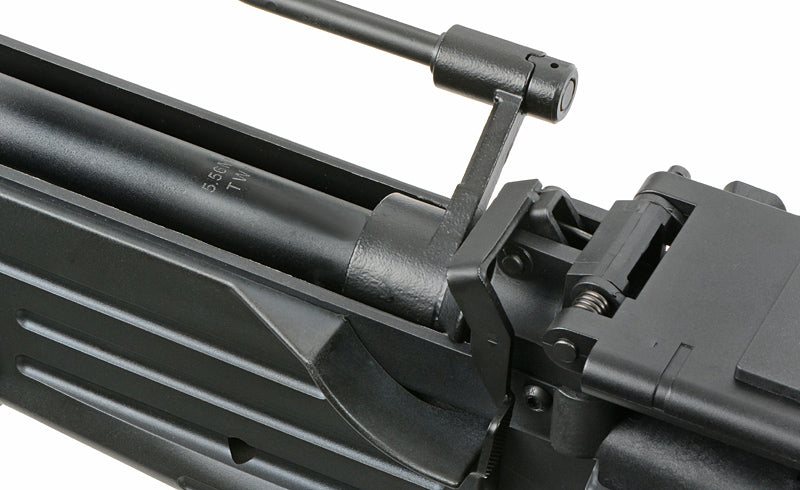 En el corazón de este rifle de airsoft se encuentra una caja de cambios M249 robusta, totalmente de metal y reforzada , cuidadosamente diseñada para soportar fuego de apoyo prolongado y continuo. La caja de cambios cuenta con un cómodo sistema de intercambio rápido de resorte. Dentro de la caja de cambios, un conjunto completo de engranajes de acero reforzados con una relación de 18:1 montados sobre cojinetes de bolas de 8 mm garantiza un funcionamiento suave, entregando una cadencia de fuego de 20 BBs por segundo .
