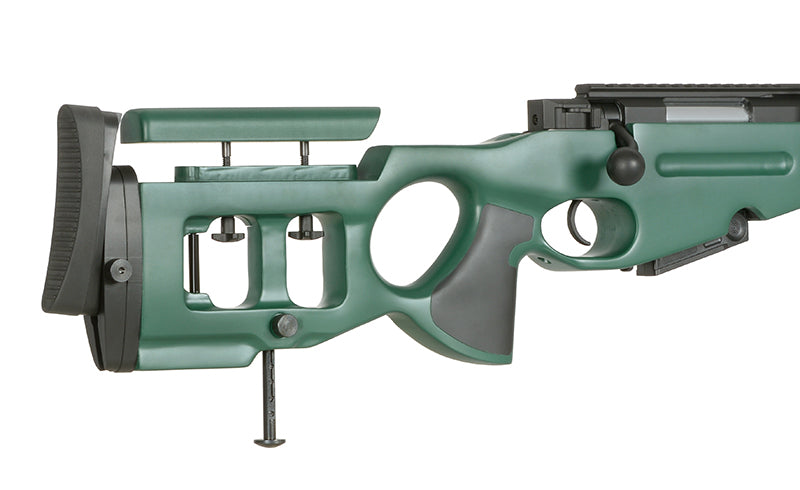 Una característica destacada de esta réplica es su robusta construcción. La culata de madera uniforme ha sido meticulosamente elaborada y lacada, ofreciendo no solo una apariencia estéticamente agradable sino también durabilidad. La culata ajustable , ubicada en la parte trasera, garantiza comodidad y adaptabilidad a las preferencias del tirador. Para mayor usabilidad, la culata incluye una almohadilla ajustable , mientras que el monópode permite un posicionamiento preciso y estabilidad al disparar a objetivos distantes.