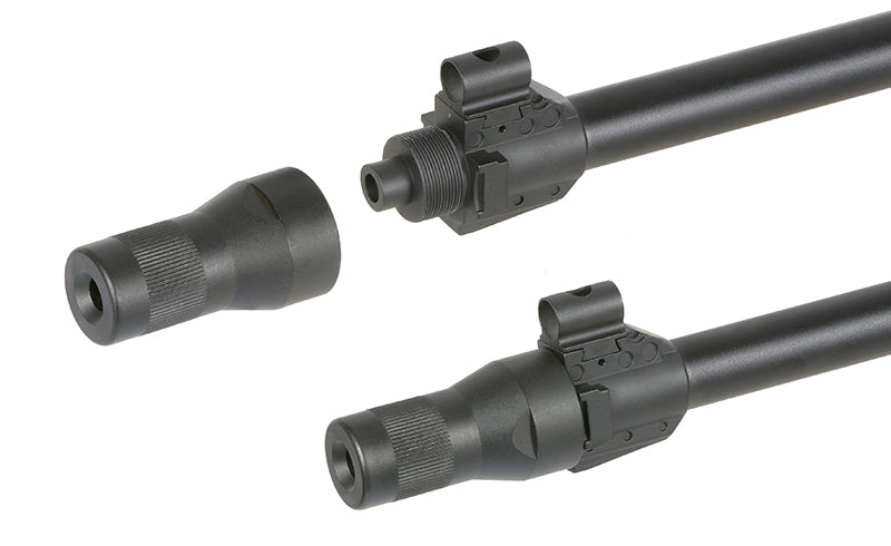 La réplica incluye una mira delantera y una mira trasera en el extremo del cañón exterior, con una rosca CCW de 14 mm para conectar un supresor de sonido y acomodar accesorios. El uso conveniente y práctico de la réplica se facilita aún más gracias al cargador MID-CAP . Fabricado con polímero resistente y equipado con un botón fácilmente intercambiable, el cargador tiene capacidad para 65 BBs. Incluso en condiciones difíciles, como con guantes, el reemplazo del cargador es muy sencillo.