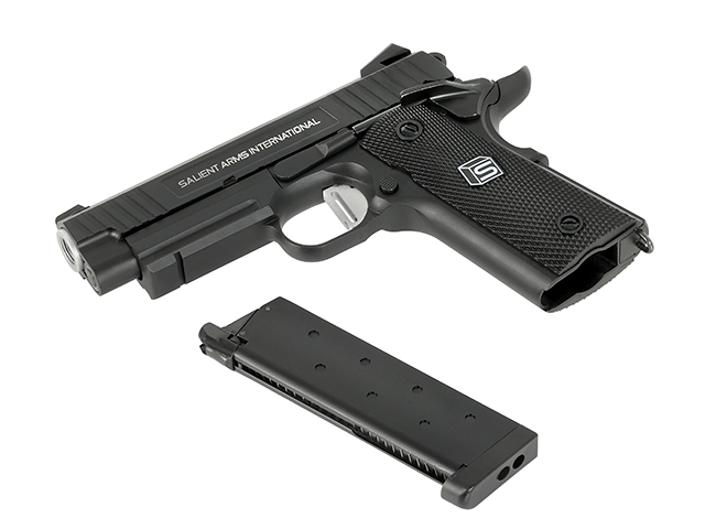 The EMG **Salient Arms 1911 STANDARD** is a result of the collaboration between EMG and Salient Arms International. The design is based on the success of the DS 2011 model, featuring a traditional single-stack 1911 frame. The replica is engineered for functionality and precision, combining aesthetics with ergonomic solutions. This model is built upon the reliable 1911 design, revered for over a century.